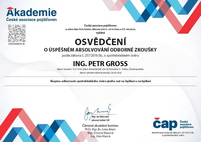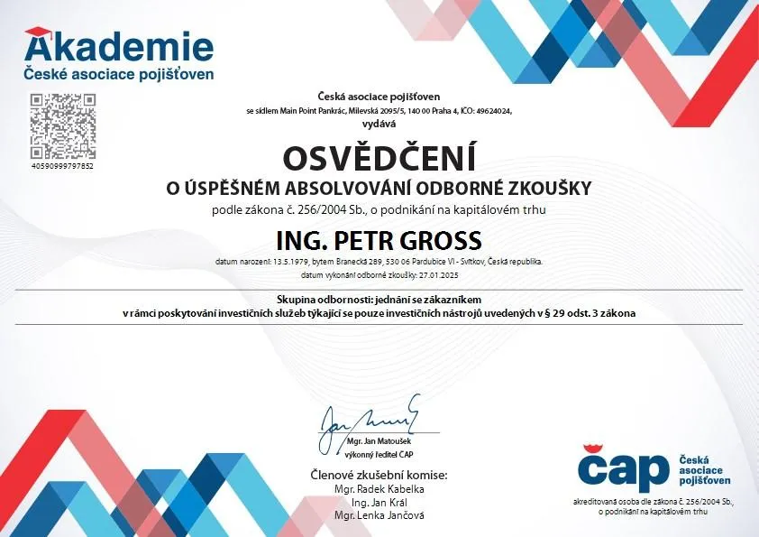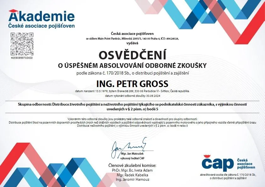 Veškerá péče, která je Vám poskytována je plně certifikována prostřednictvím České asociace pojišťoven (ČAP), které Česká národní banka udělila akreditaci k provádění odborných zkoušek.